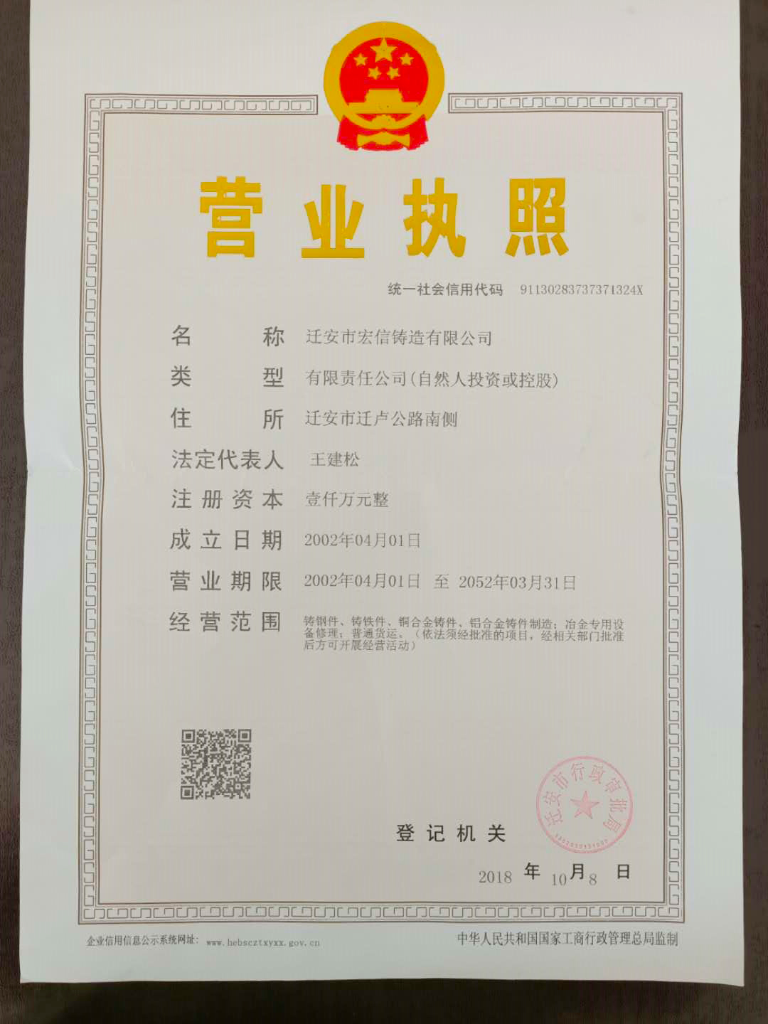 遷安市宏信鑄造有限公司原為遷安縣第一鑄鋼廠,始建于1992年,目前已有28年歷史。公司法人王建松,注冊(cè)資金1000萬(wàn)元,廠區(qū)位于遷安市遷盧公路南側(cè)丁官營(yíng)路段,占地7畝。2007年在原有規(guī)模的基礎(chǔ)上又在遷安市遷盧公路南側(cè)沙河子村東開(kāi)辦了分廠——遷安市宏信鑄造有限公司耐磨金屬材料廠,占地7.1畝。目前全公司擁有職工70人。